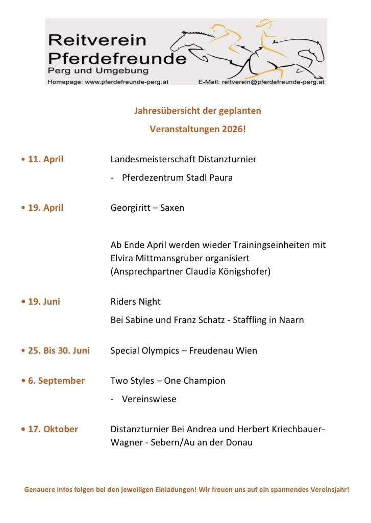 Anbei seht ihr noch die Jahresplanung für 2026 👍🏻 Gleich in den Terminkalender eintragen – wir sind schon motiviert und freuen uns auf viele Bekannte und auch neue Gesichter🐴